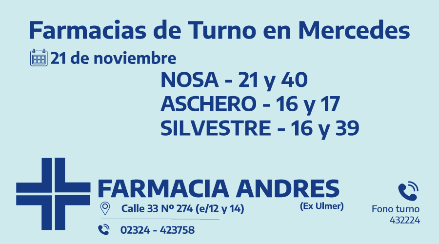 Desde la hora 8:30 del día de hoy, hasta la misma hora de mañana, las farmacias de turno en Mercedes son: Nosa, Aschero y Silvestre.
