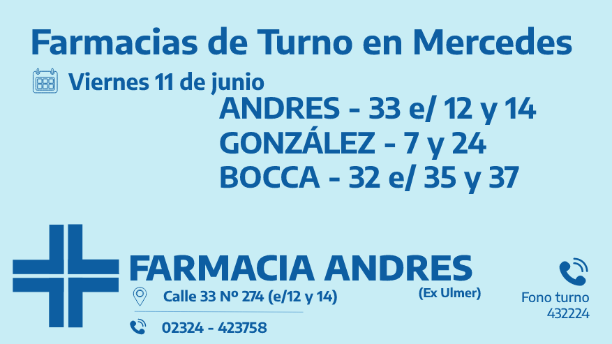 Desde las 8:30 del día de hoy hasta la misma hora de mañana, las farmacias de turno en Mercedes son: Andrés, González y Bocca.