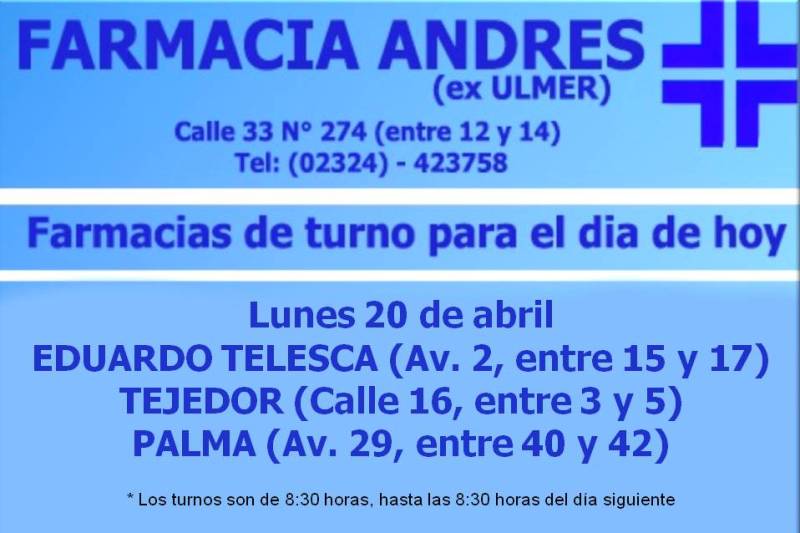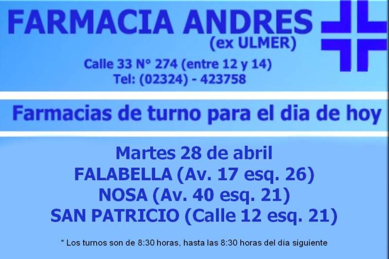Desde las 8:30 del día de hoy hasta la misma hora de mañana, las farmacias de turno son: Andrés, Bocca y González