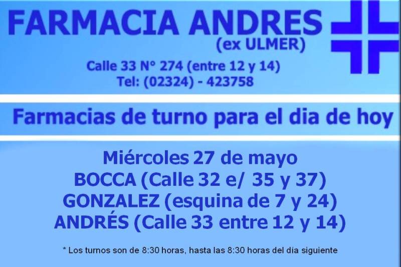 Desde las 8:30 del día de hoy hasta la misma hora de mañana, las farmacias de turno son: Andrés, Bocca y González