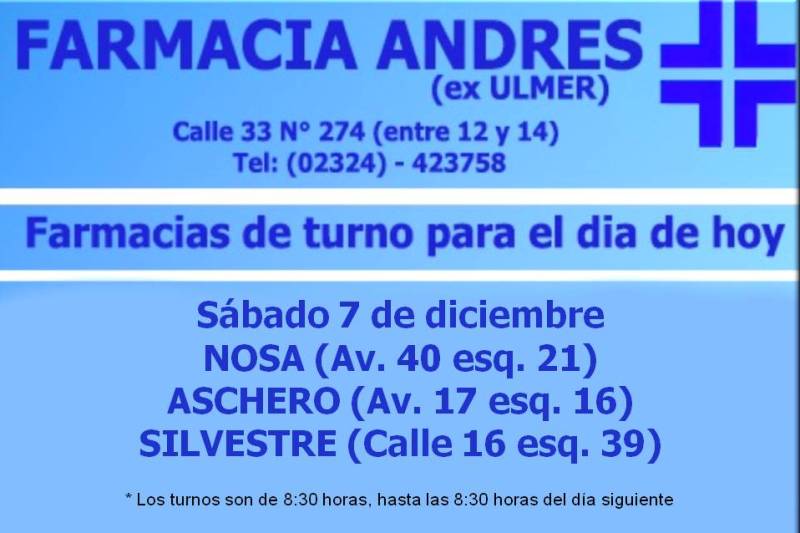 Las farmacias de turno desde hoy 8:30 hasta mañana a la misma hora son: NOSA, ASCHERO y SILVESTRE.