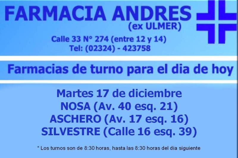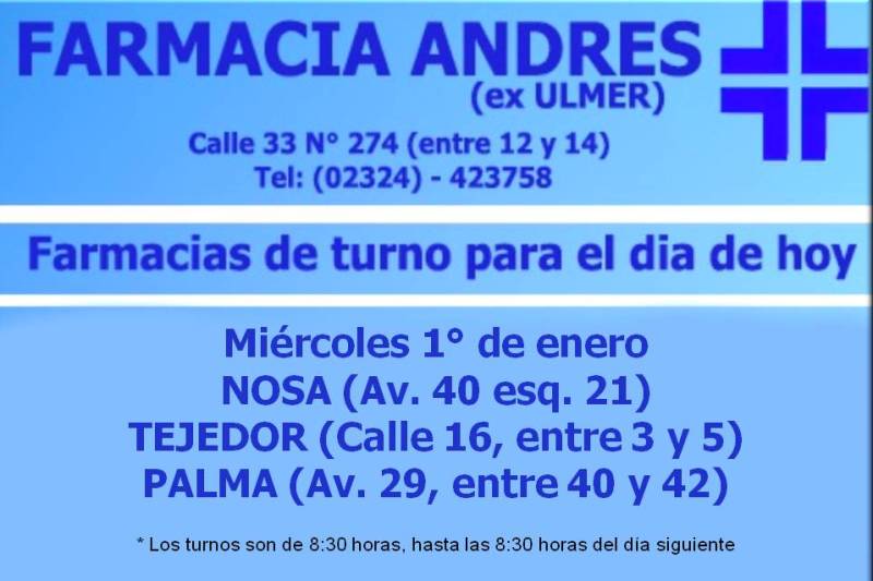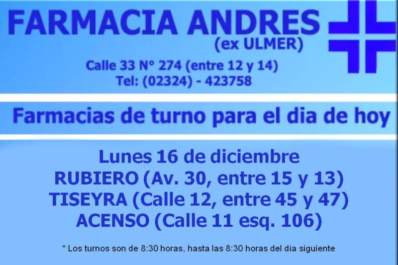 Desde hoy a las 8:30 y hasta mañana la misma hora, las farmacias de turno son: Andrés, Rubiero y D’Agosto