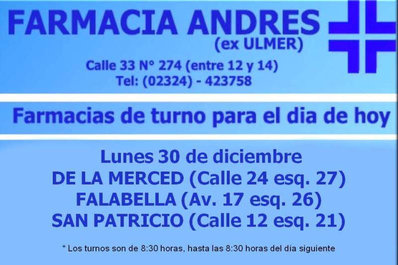 Las farmacias de turno desde hoy 8:30 hasta mañana a la misma hora son: De la Merced, Santa María y San Patricio