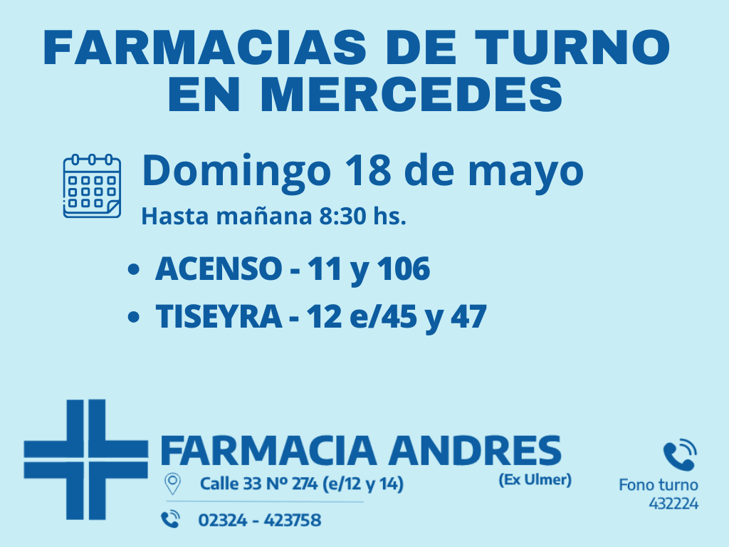 Desde las 8 30 del día de hoy hasta la misma hora de mañana las farmacias de turno en Mercedes son Acenso y Tiseyra