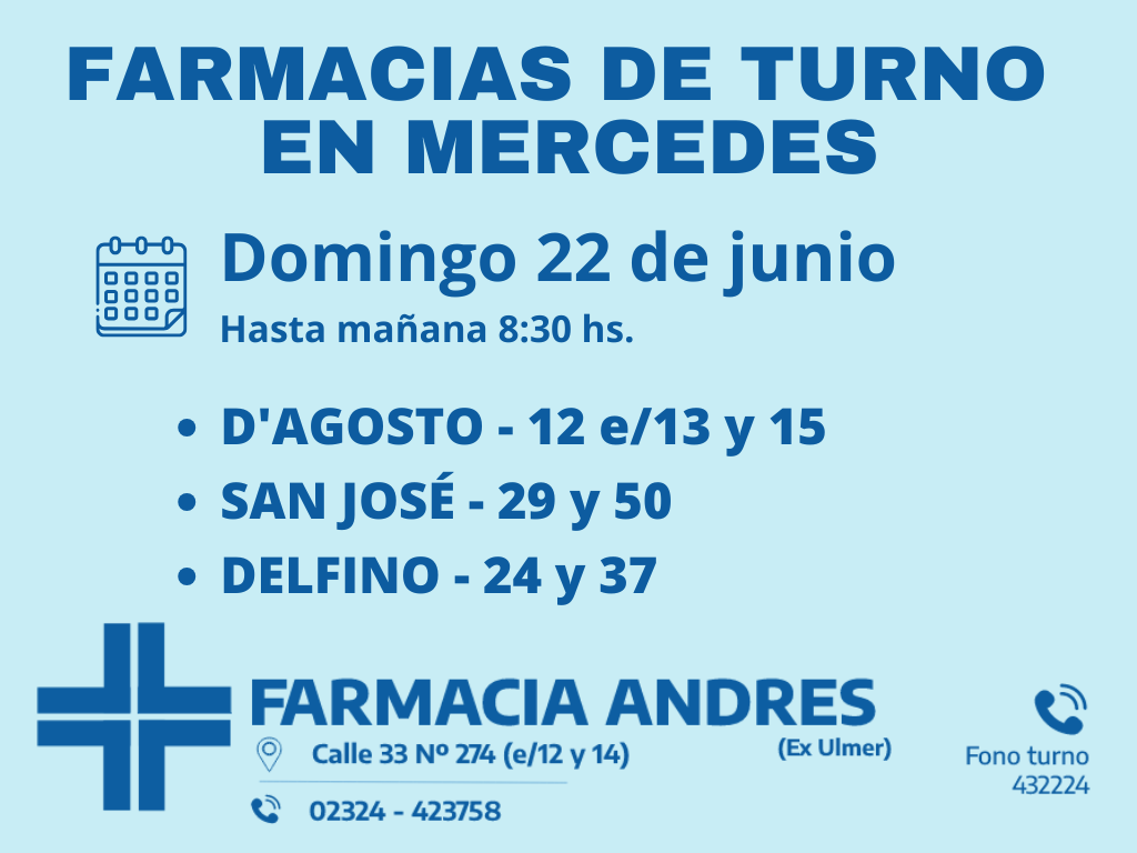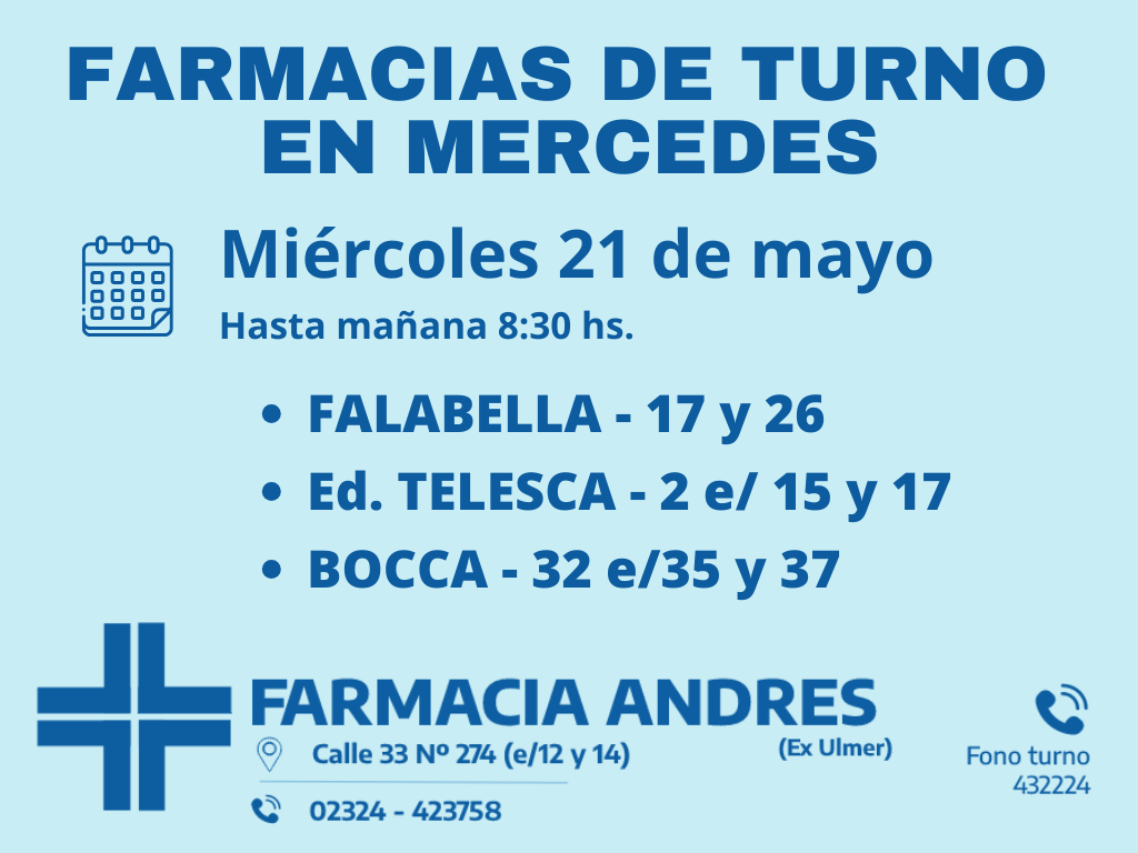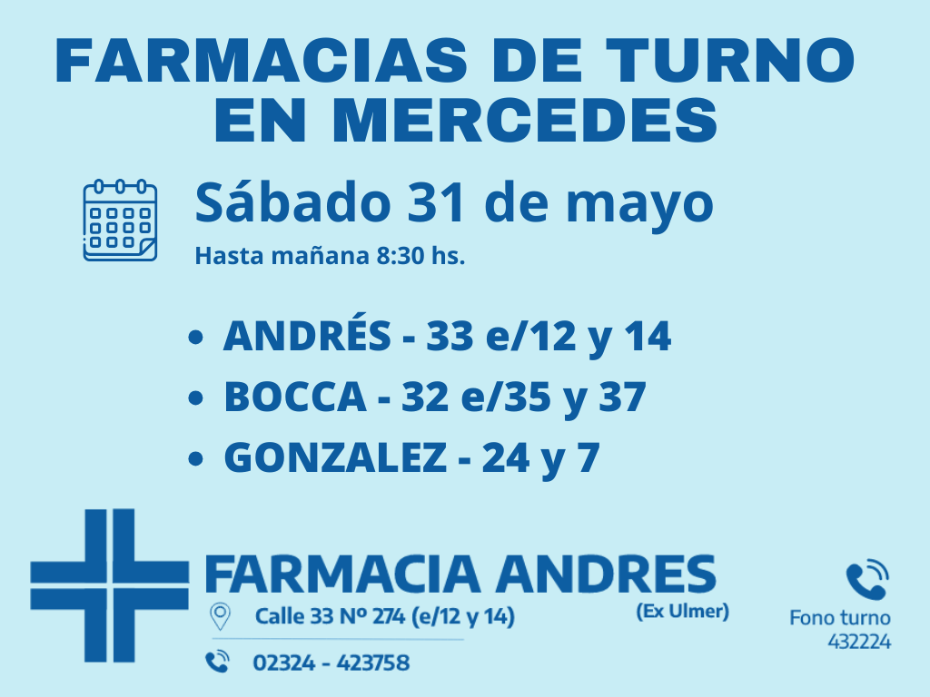 Desde las 8 30 del día de hoy hasta la misma hora de mañana las farmacias de turno en Mercedes son Andrés, González y Bocca