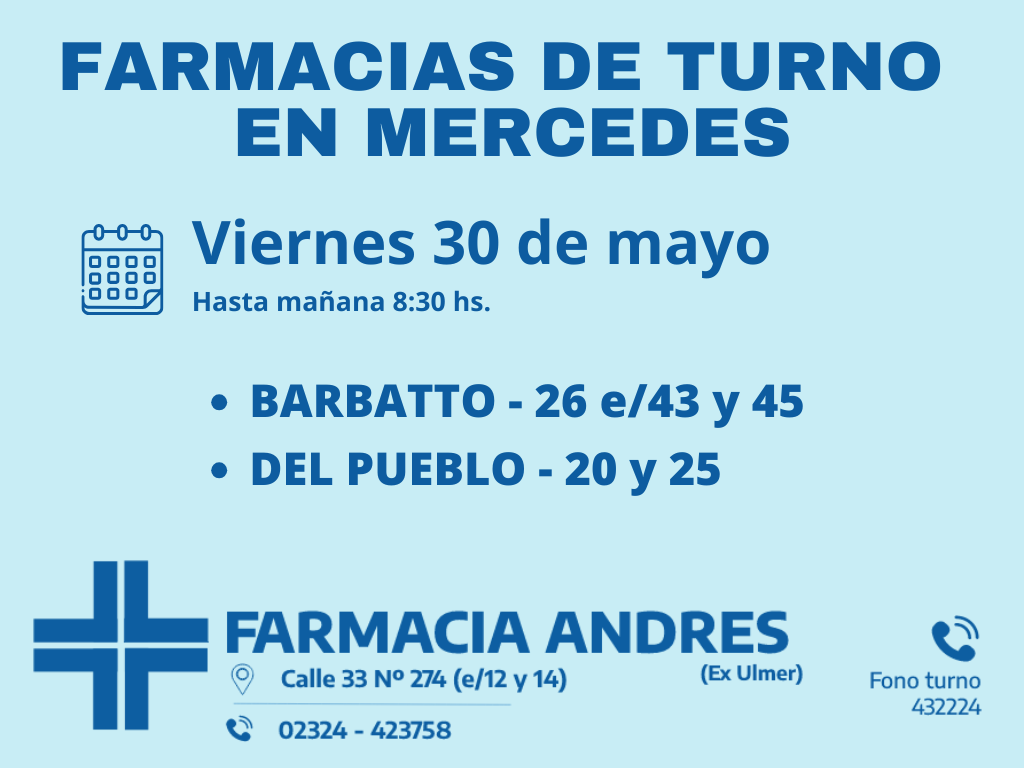 Desde las 8:30 del día de hoy hasta la misma hora de mañana, las farmacias de turno en Mercedes son: Barbatto y Del Pueblo