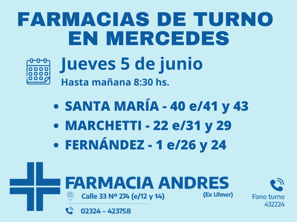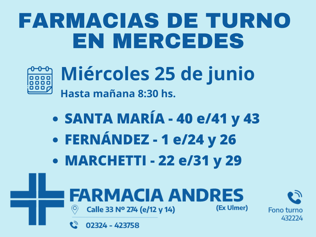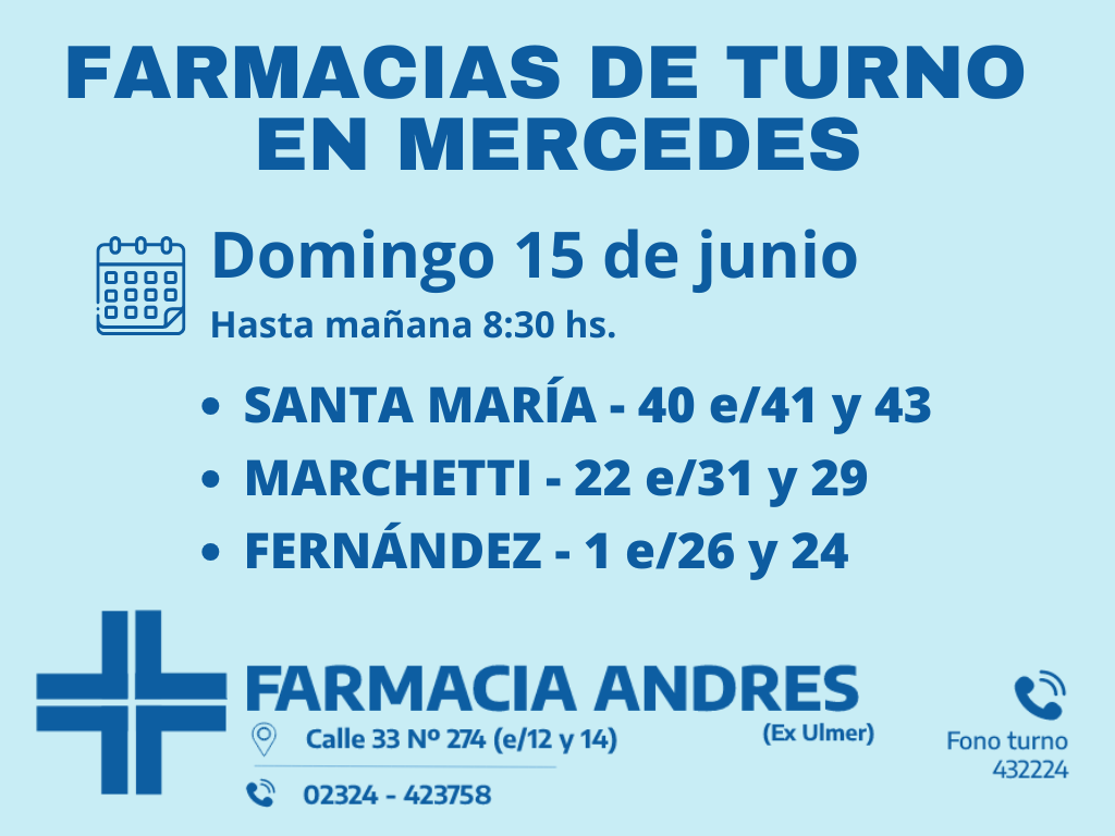 Desde las 8:30 del día de hoy hasta la misma hora de mañana, las farmacias de turno en Mercedes son: Santa María, Fernández, y Marchetti.