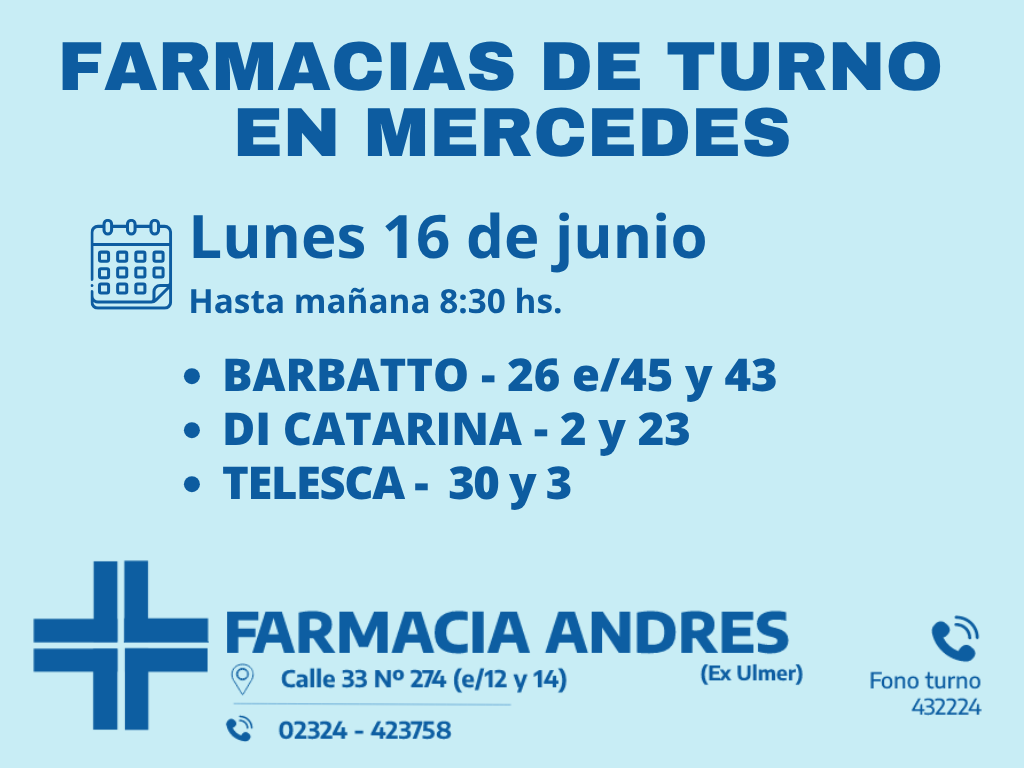 Desde las 8:30 del día de hoy hasta la misma hora de mañana, las farmacias de turno en Mercedes son: Di Catarina, Barbatto y Telesca.