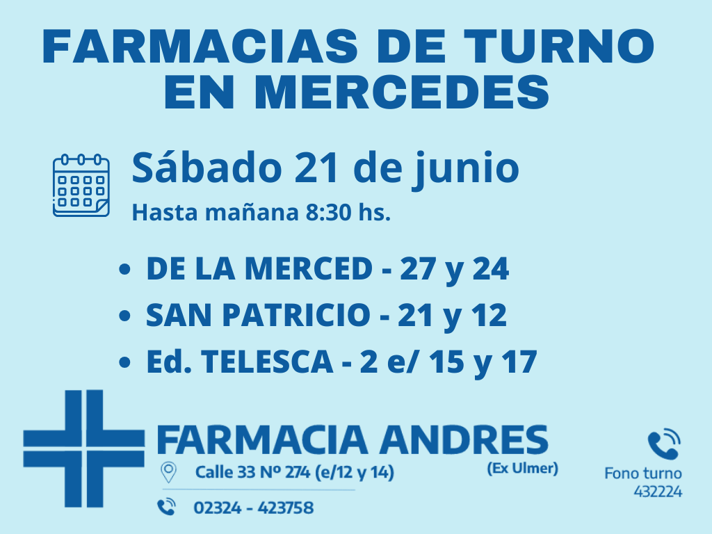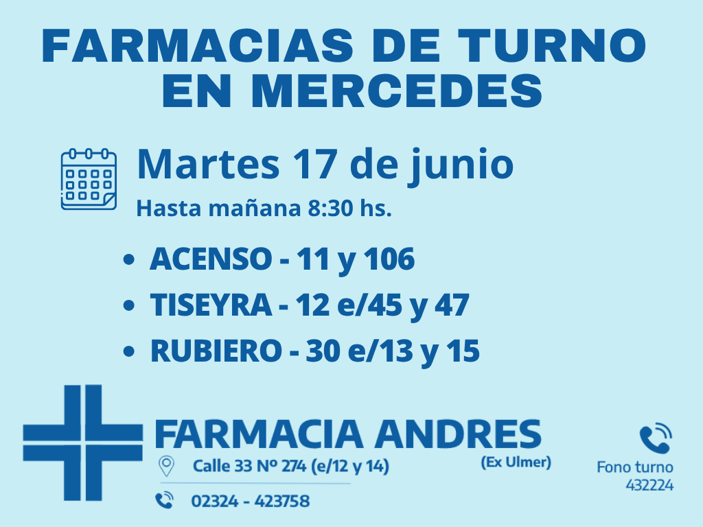 Desde las 8:30 del día de hoy hasta la misma hora de mañana, las farmacias de turno en Mercedes son: Rubiero, Eduardo Telesca y Tejedor.