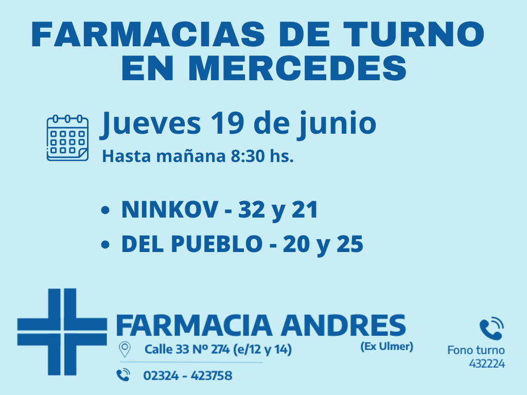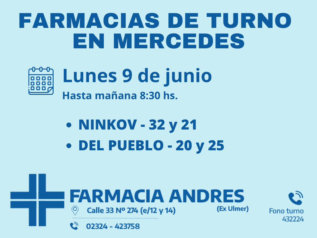 Desde las 8 30 del día de hoy hasta la misma hora de mañana las farmacias de turno en Mercedes son Ninkov y Del Pueblo
