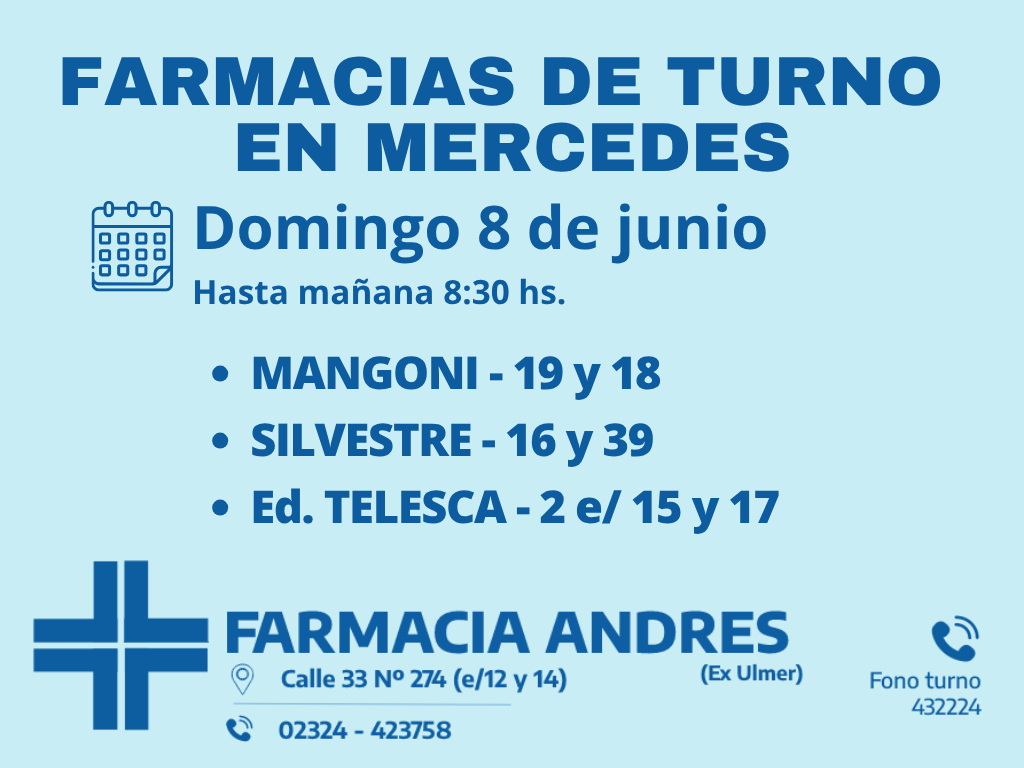 Desde las 8 30 del día de hoy hasta la misma hora de mañana las farmacias de turno en Mercedes son Mangoni, Silvestre y Nosa.