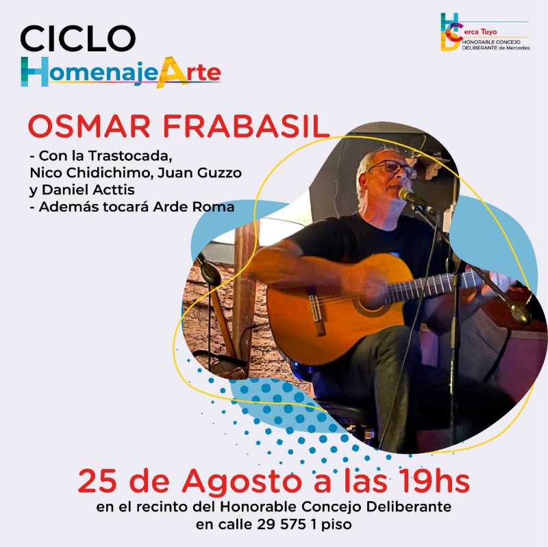 A partir de la hora 19 del jueves 25 de agosto, el Ciclo del Concejo Deliberante de Mercedes HomenajeArte presentará a Osmar Frabasil al que le darán un reconocimiento en nombre de la ciudad