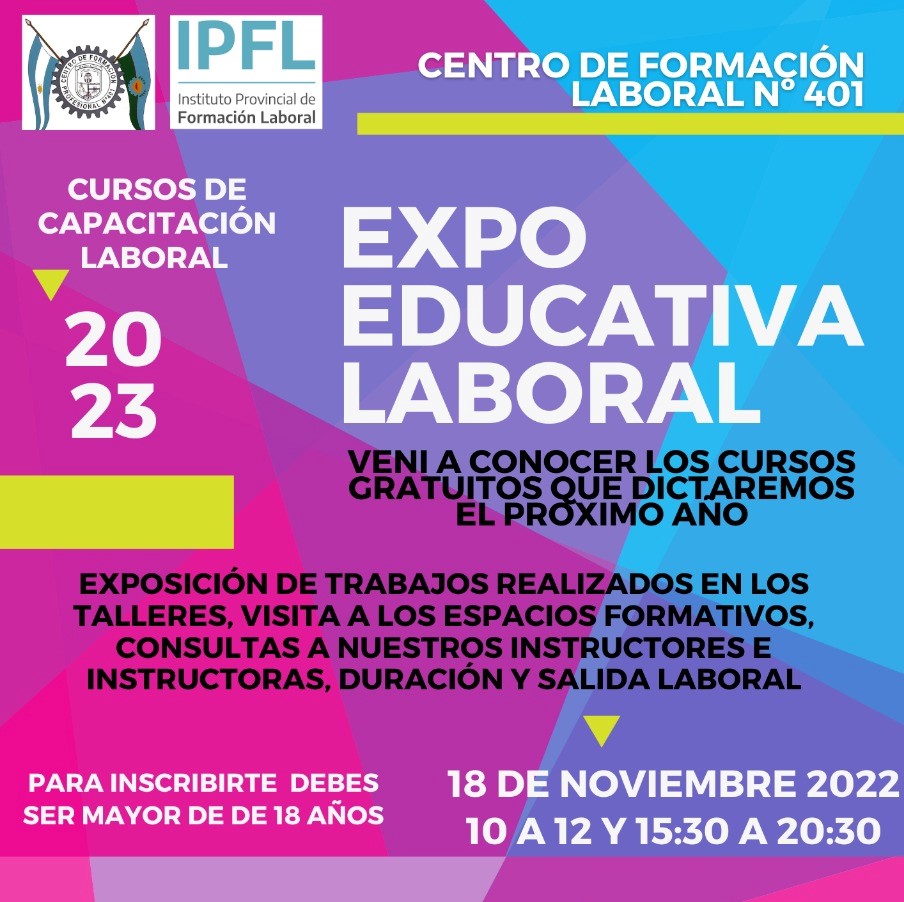 El Centro de Formación Laboral Nº 401 llevará adelante este viernes 18 de noviembre, una Expo Educativa Laboral. Orientada a los estudiantes de los últimos años de las escuelas secundaria públicas y privadas, la exposición presentará los cursos gratuitos que se darán en el 2023.