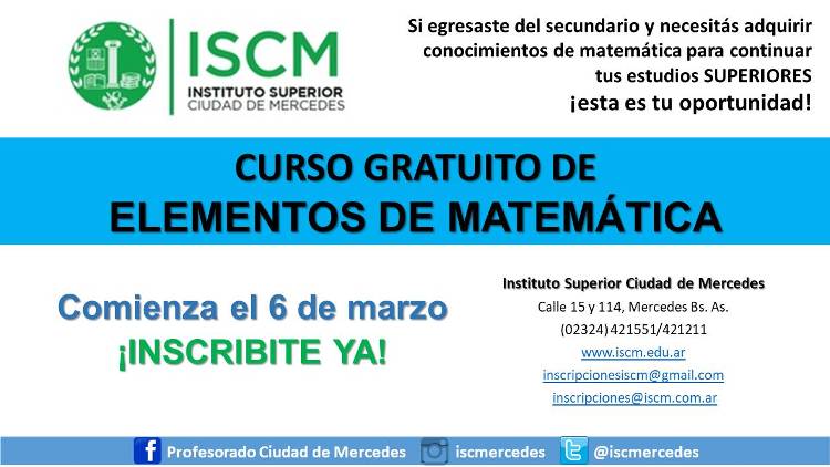 El Instituto Superior “Ciudad de Mercedes” dictará el curso de “Elementos de Matemática” durante el mes de marzo de 2019. Es de carácter gratuito y … Leer.