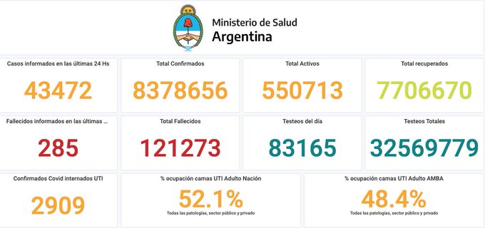 El Ministerio de Salud de la Nación confirmó este lunes 43.472 nuevos contagios de coronavirus y 285 muertes. Con estos datos, el total de casos … Leer.
