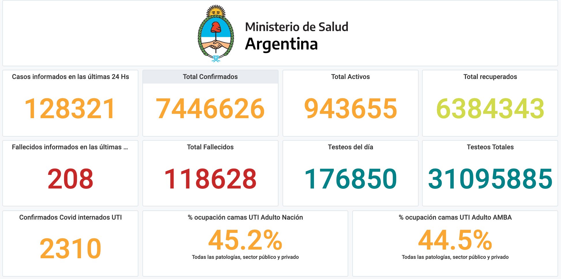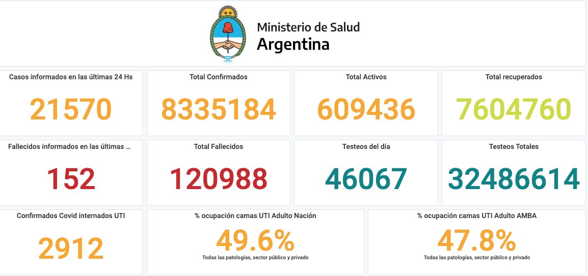 El Ministerio de Salud de la Nación informó este domingo que se registraron 21.570 nuevos contagios de coronavirus y 152 muertes. Con estos datos, el … Leer.