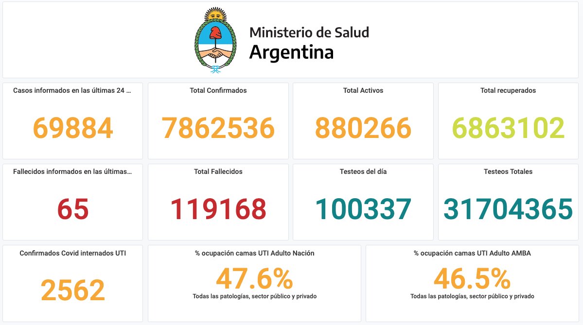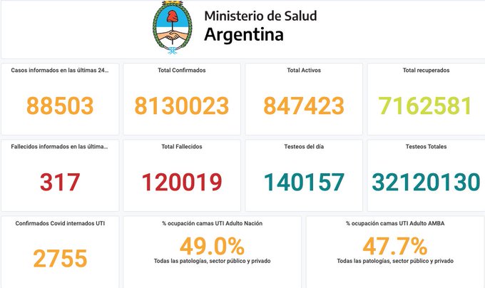 El Ministerio de Salud de la Nación informó este miércoles que se registraron 88.503 nuevos contagios de coronavirus y 317 fallecimientos. Con estos datos, Argentina … Leer.
