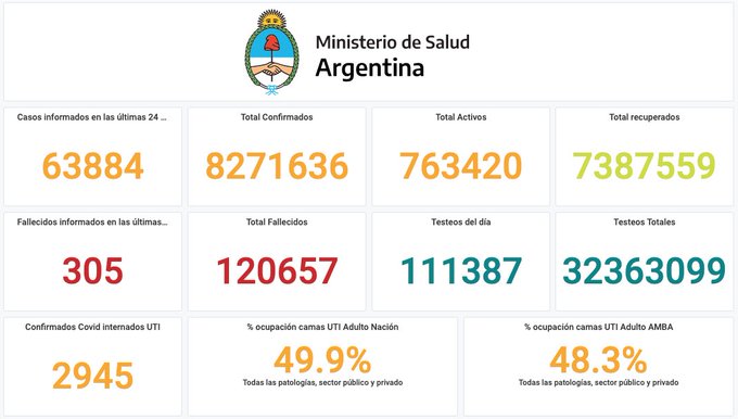 El Ministerio de Salud de la Nación informó este viernes que se registraron 63.884 nuevos contagios de coronavirus y 305 muertes. Con estos datos, el … Leer.