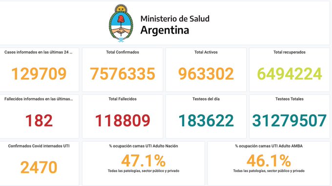 El Ministerio de Salud informó en la tarde de este miércoles más de 130 mil positivos. Además, registraron el fallecimiento de 75 personas con covid … Leer.