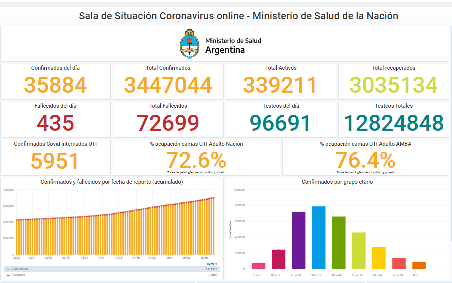 El Ministerio de Salud de la Nación informó 39.652 nuevos contagios y 494 muertes en las últimas 24 horas. Se realizaron 125..578 testeos, con un … Leer.