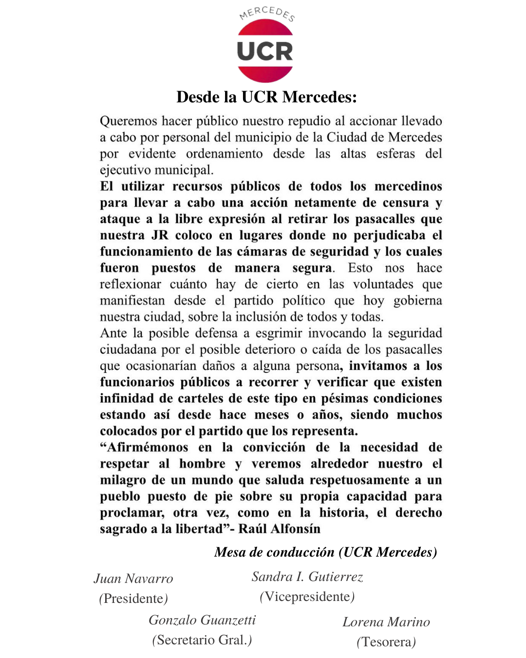 La Juventud Radical de Mercedes hizo público un repudio a la actitud de la comuna de retirar unos pasacalles que expresaban la opinión de la … Leer.