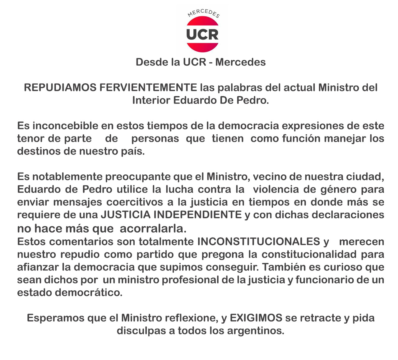 Desde la Unión Cívica Radical de Mercedes, en especial de las mujeres del centenario político, respudiaron los dichos del Ministro del Interior que «utilizó la … Leer.