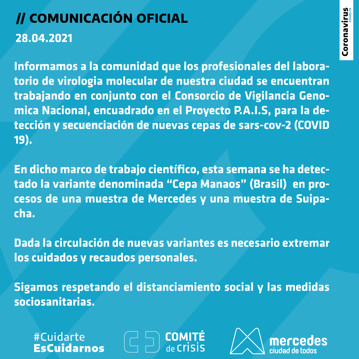 Desde un comunicado oficial el Comité de Crisis se anunció que se detectó la Cepa Manaos de Covid-19 en una muestra de Mercedes y una … Leer.