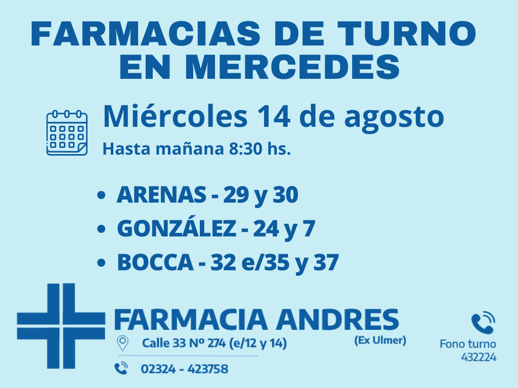 Desde las 8:30 del día de hoy hasta la misma hora de mañana, las farmacias de turno en Mercedes son Santa María, Fernández y Marchetti.