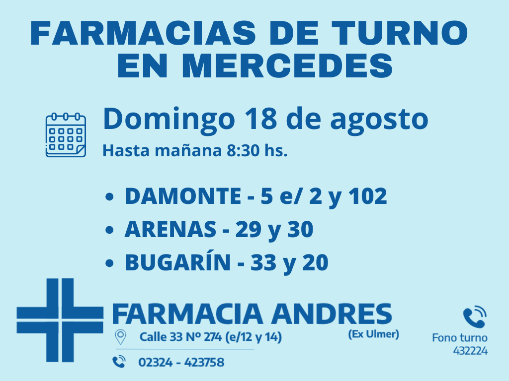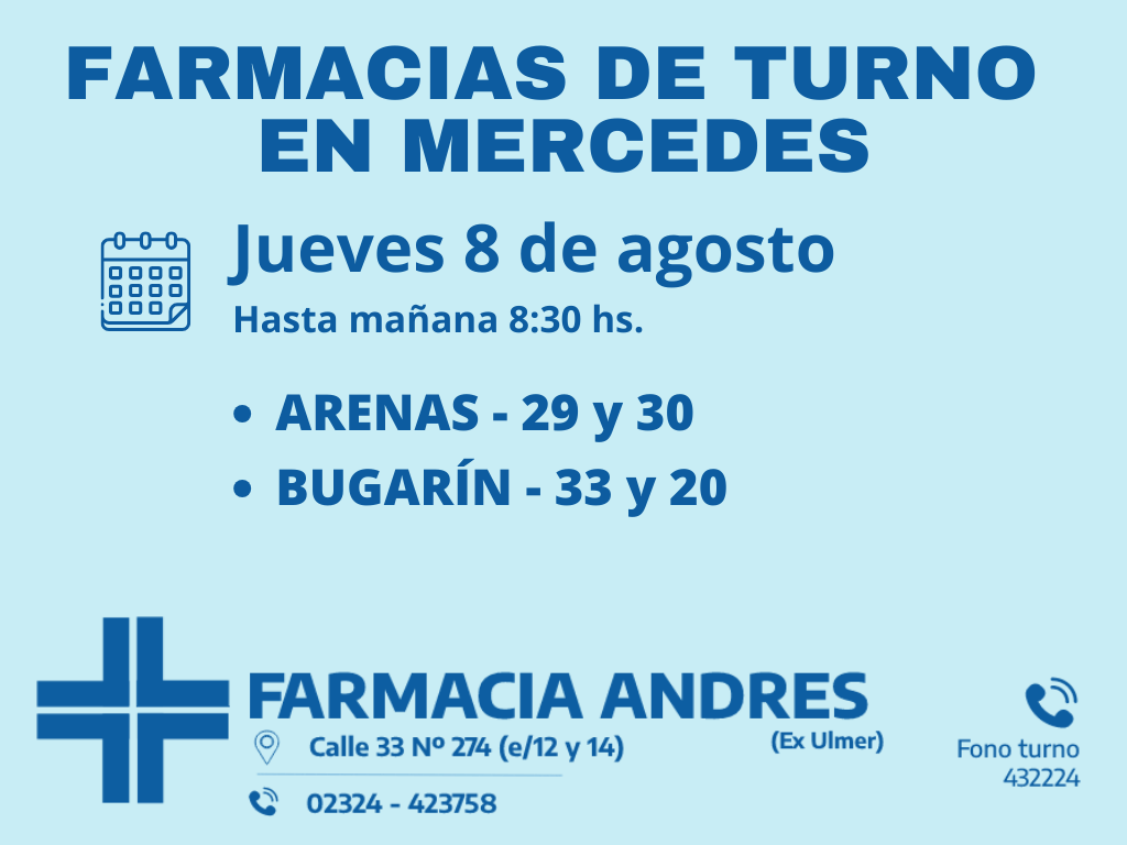 Desde las 8:30 del día de hoy hasta la misma hora de mañana, las farmacias de turno en Mercedes son Arenas y Bugarin.