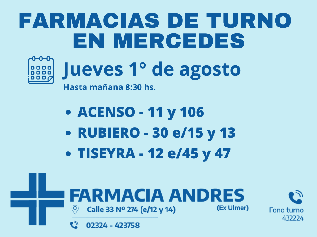 Desde las 8:30 del día de hoy hasta la misma hora de mañana, las farmacias de turno en Mercedes son: Acenso, Rubiero y Tiseyra.