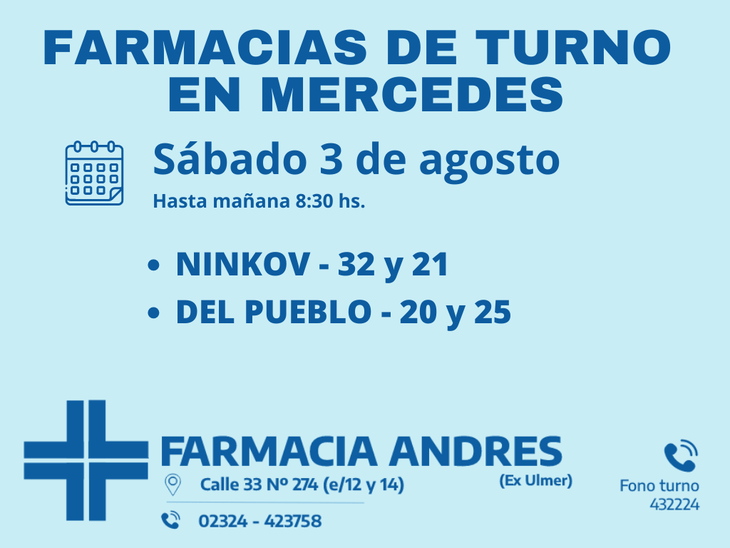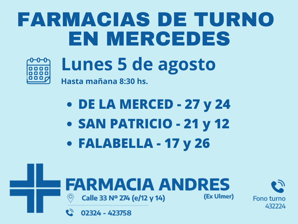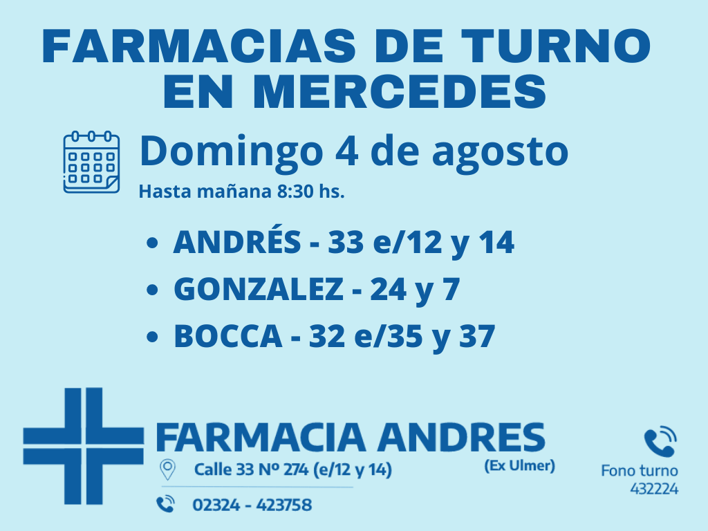Desde las 8 30 del día de hoy hasta la misma hora de mañana las farmacias de turno en Mercedes son Andrés, Gonzalez y Bocca