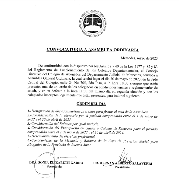 El Colegio de Abogados del Departamento Judicial Mercedes convoca a Asamblea General Ordinaria. Será el día 30 de mayo, en la sede de la institución … Leer.