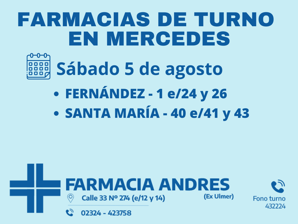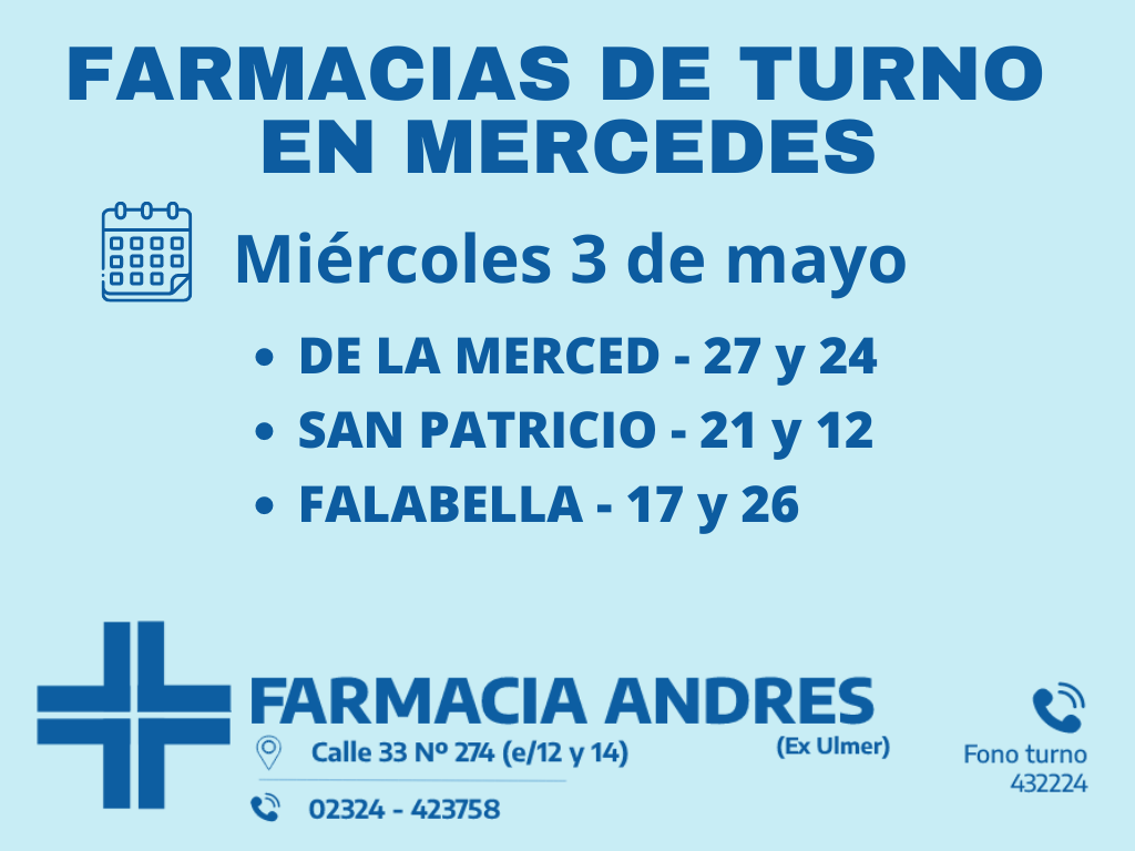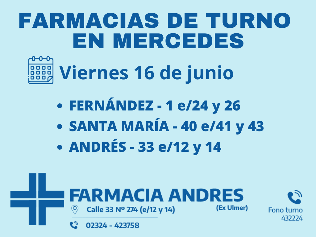 Desde las 8:30 del día de hoy hasta la misma hora de mañana, las farmacias de turno en Mercedes son: Andrés, Santa María y Fernández.