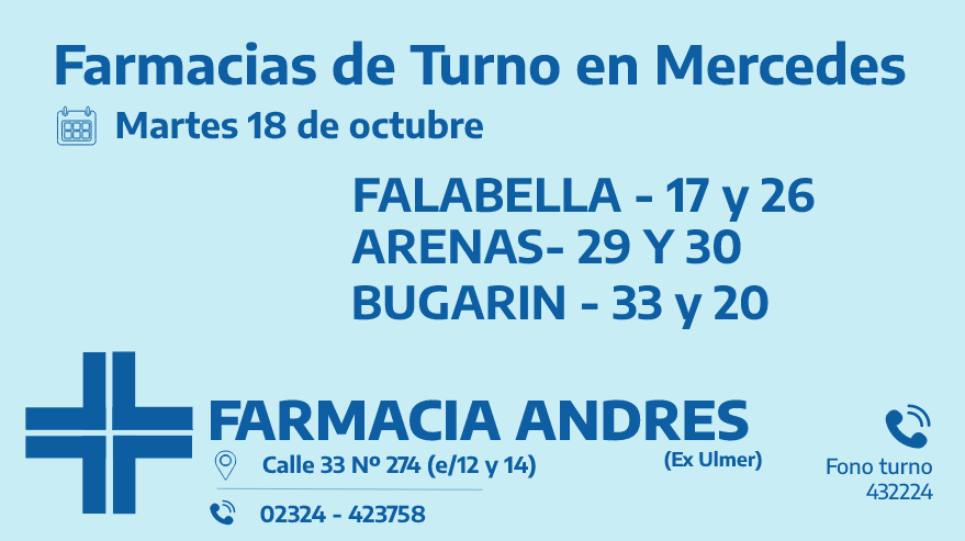 Desde las 8:30 del día de hoy hasta la misma hora de mañana, las farmacias de turno en Mercedes son: Eduardo Telesca, Tejedor y Palma.