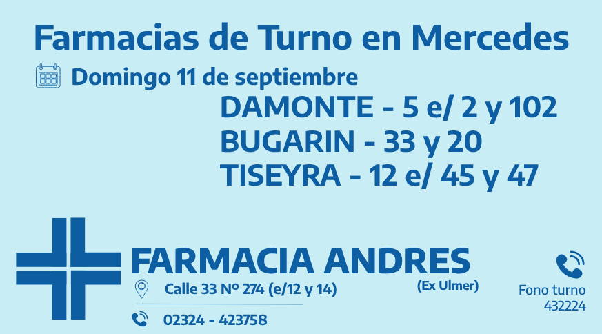 Desde las 8:30 del día de hoy hasta la misma hora de mañana las farmacias de turno en Mercedes son Damonte, Bugarin y Tiseyra.