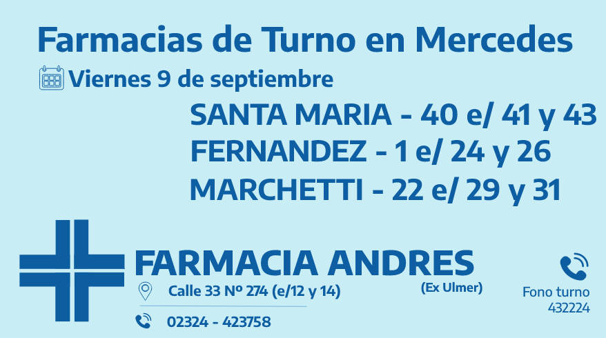 Desde las 8:30 del día de hoy hasta la misma hora de mañana, las farmacias de turno en Mercedes son: Santa María, Fernández y Marchetti.