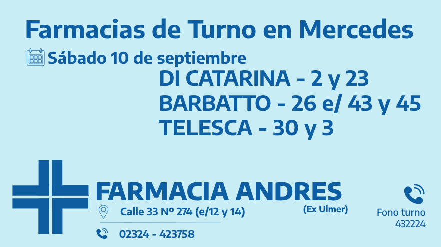 Desde las 8:30 del día de hoy hasta la misma hora de mañana, las farmacias de turno en Mercedes son: Di Catarina, Barbatto y Telesca.