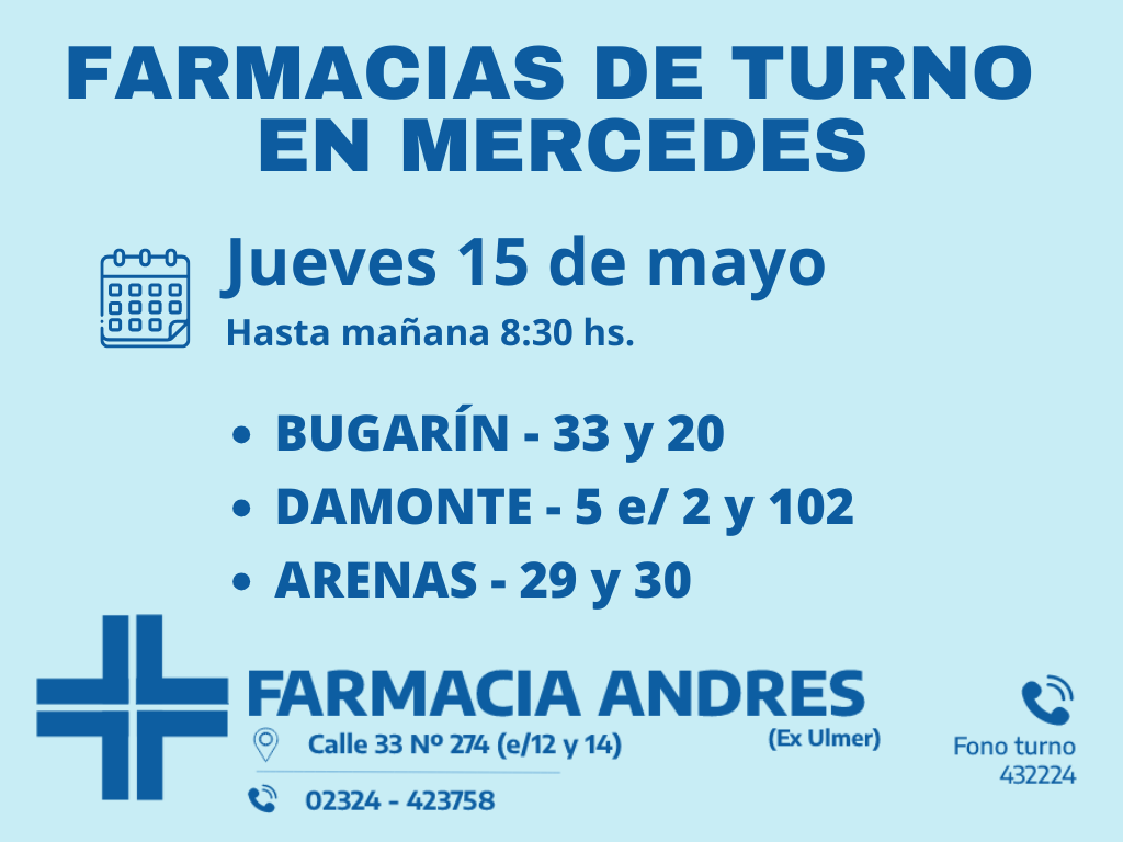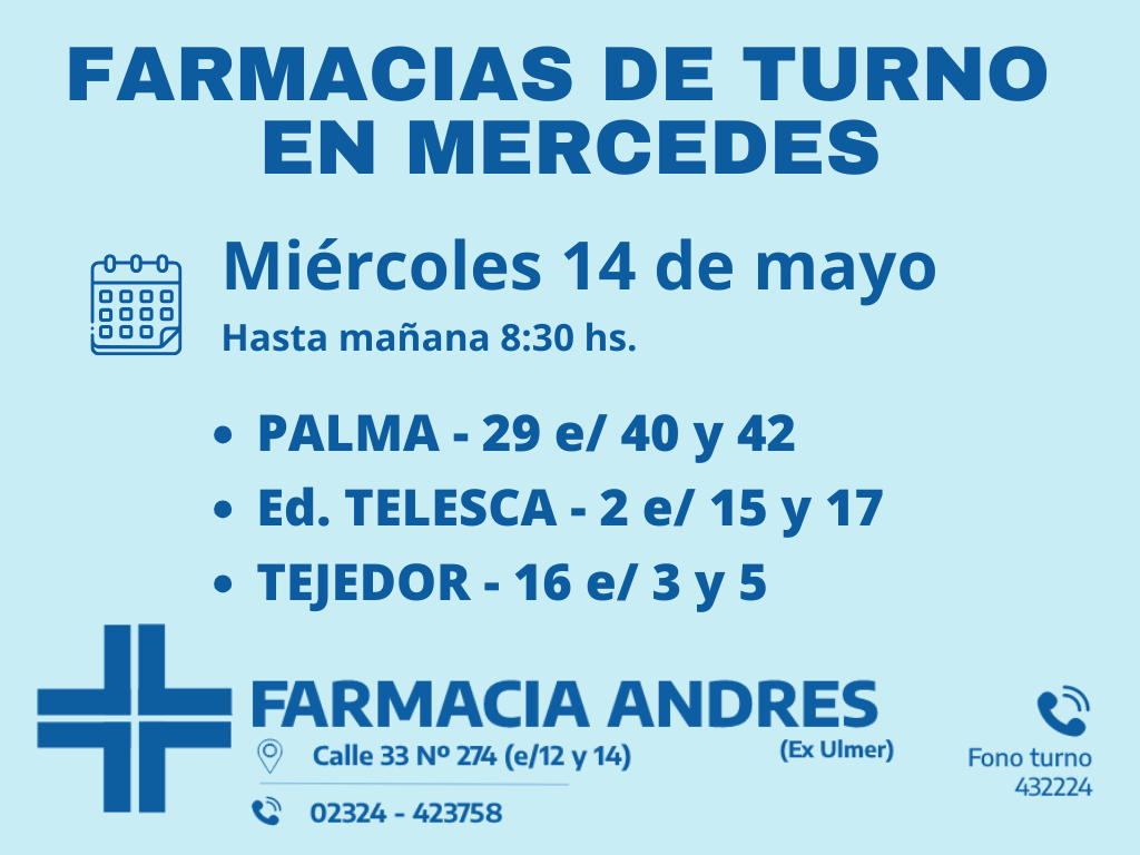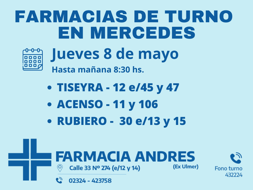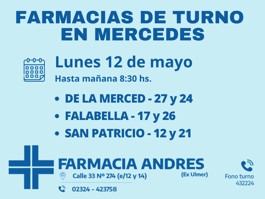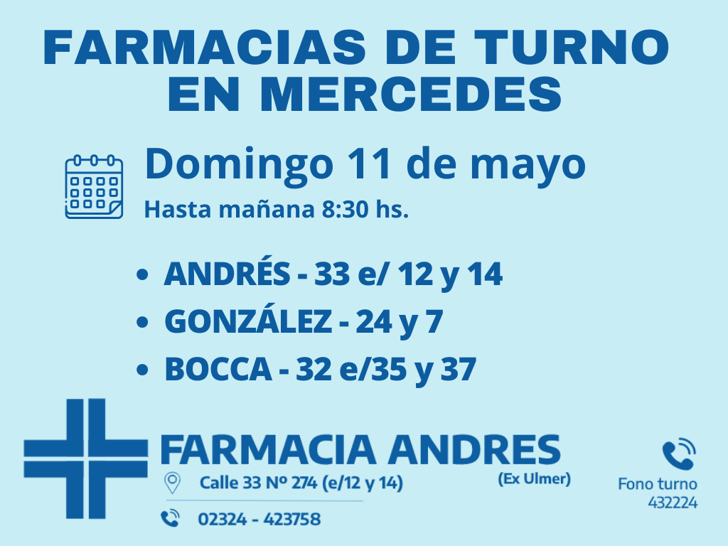 Desde las 8:30 del día de hoy hasta la misma hora de mañana, las farmacias de turno en Mercedes son: Andrés, González y Bocca.