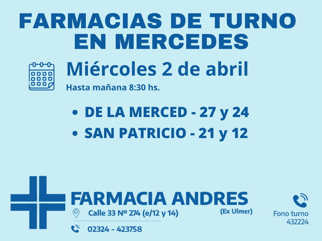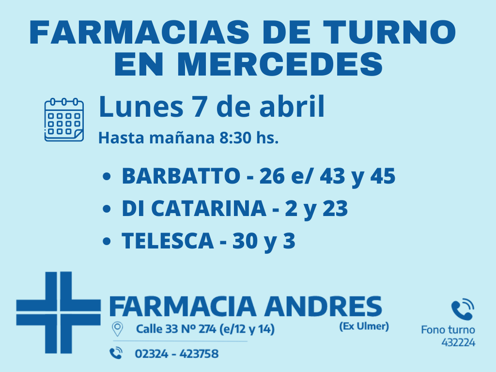 Desde las 8:30 del día de hoy hasta la misma hora de mañana, las farmacias de turno en Mercedes son: Barbatto, Di Catarina y Telesca.