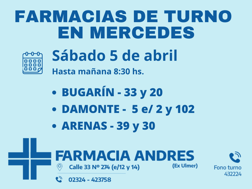 Desde las 8 30 del día de hoy hasta la misma hora de mañana las farmacias de turno en Mercedes son Bugarin, Damonte y Arenas