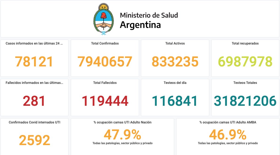 El Ministerio de Salud de la Nación informó este lunes 24 de enero que se registraron 78.121 nuevos contagios de coronavirus y 281 muertes. El … Leer.