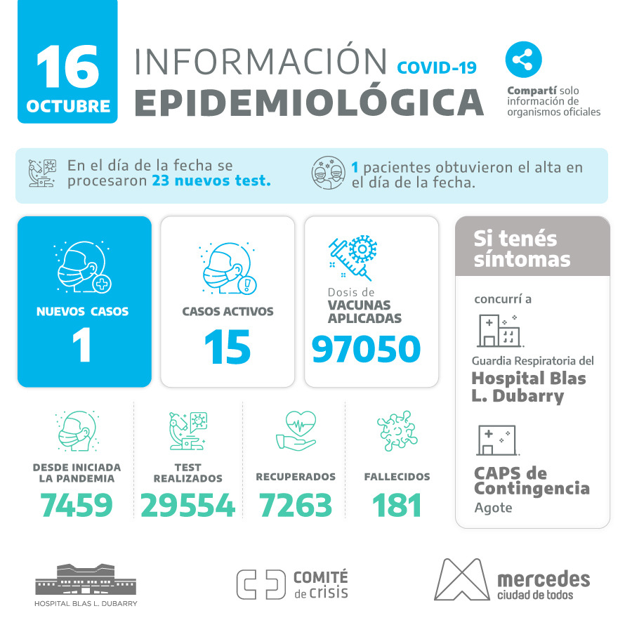 Jornada con 1 caso positivo en Mercedes en 31 nuevos testeros realizados y sin altas médicas en la fecha.