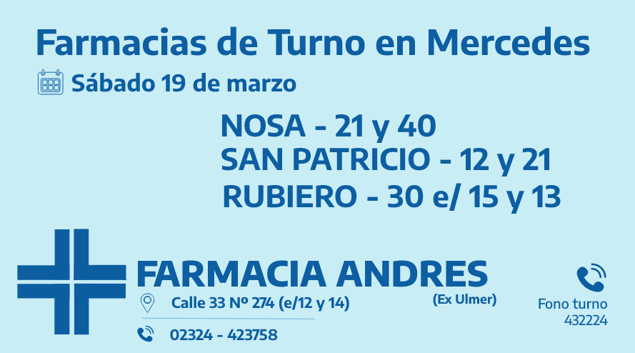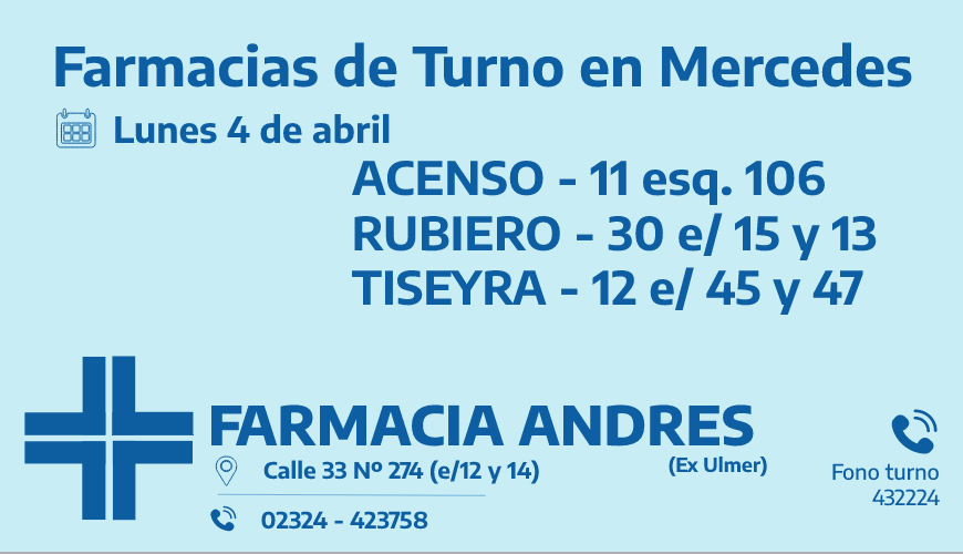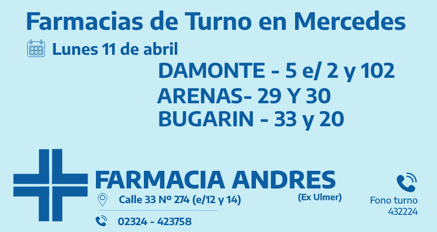 Desde las 8:30 del día de hoy hasta la misma hora de mañana, las farmacias de turno en Mercedes son: Andrés, González y Bocca.