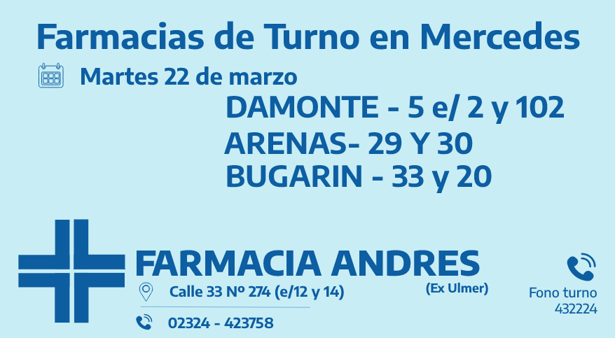 Desde las 8:30 del día de hoy hasta la misma hora de mañana, las farmacias de turno en Mercedes son: Damonte, Arenas y Bugarín.