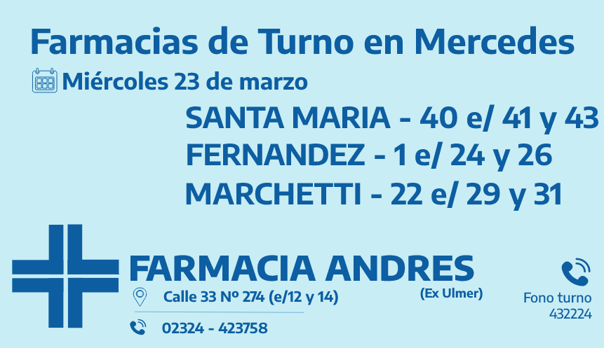 Desde las 8:30 del día de hoy hasta la misma hora de mañana, las farmacias de turno en Mercedes son: Santa María, Fernández y Marchetti.