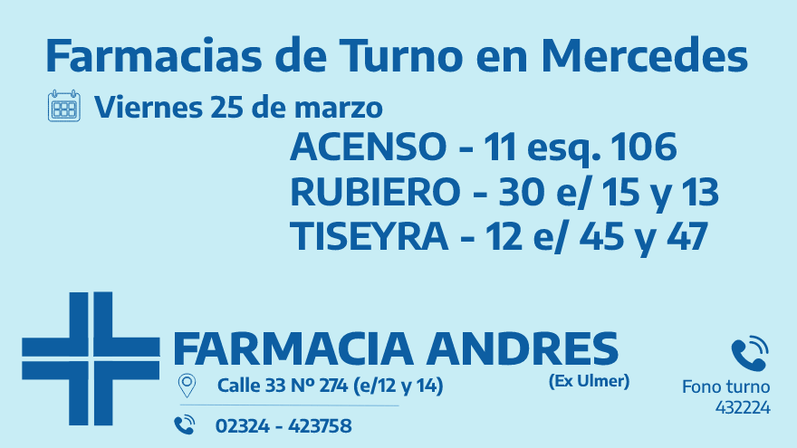 Desde las 8:30 del día de hoy hasta la misma hora de mañana, las farmacias de turno en Mercedes son: Acenso, Rubiero y Tiseyra