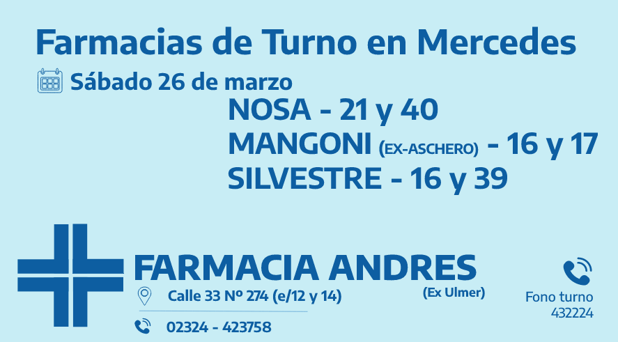 Desde las 8:30 del día de hoy hasta la misma hora de mañana, las farmacias de turno en Mercedes son: Nosa, Mangoni y Silvestre.