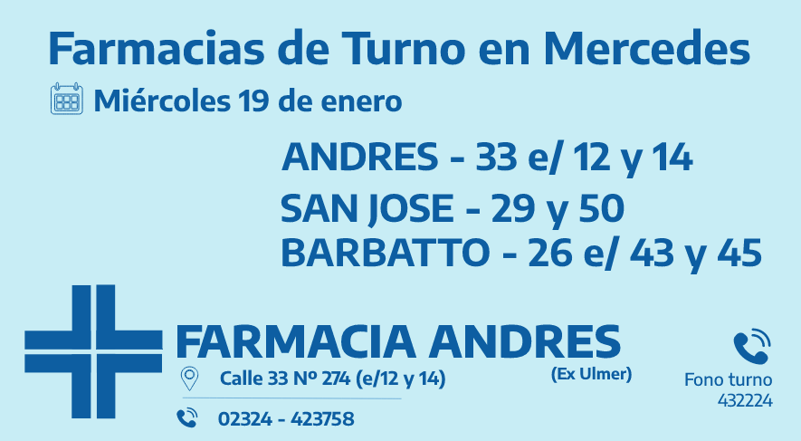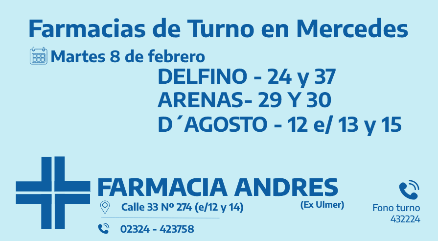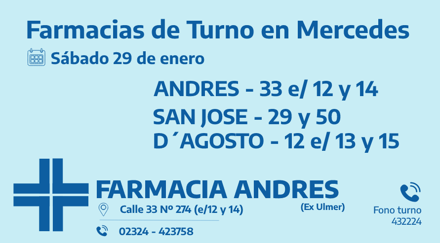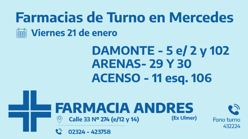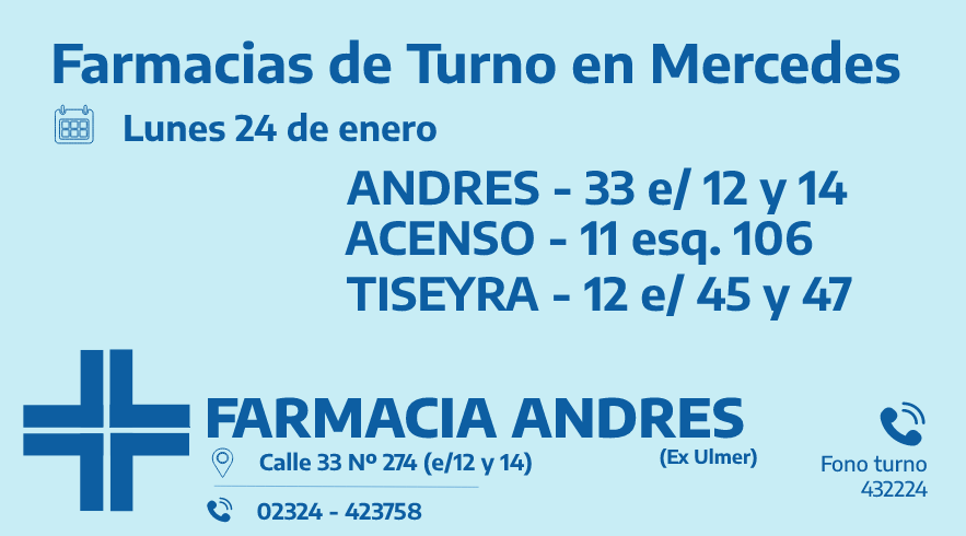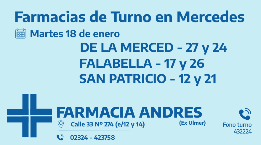 Desde las 8:30 del día de hoy hasta la misma hora de mañana las farmacias de turno en Mercedes son: Andrés, Acenso y Tiseyra.