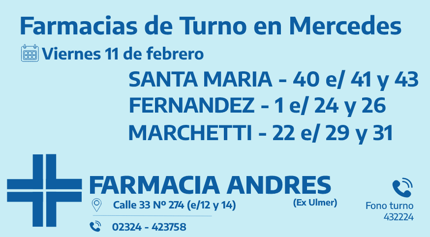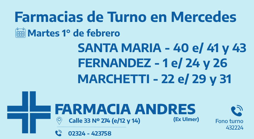 Desde las 8:30 del día de hoy hasta la misma hora de mañana, las farmacias de turno en Mercedes son: Santa María, Fernández y Marchetti.
