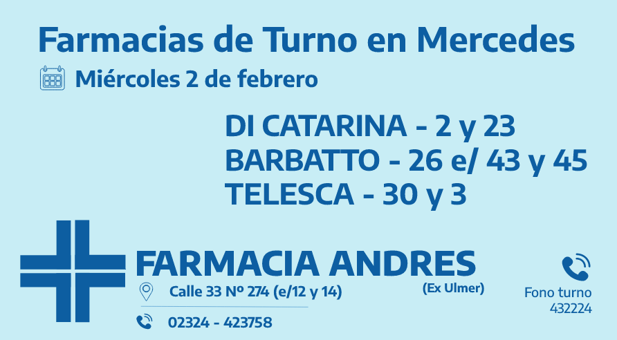 Desde las 8:30 del día de hoy hasta la misma hora de mañana, las farmacias de turno en Mercedes son: Andrés, Nosa y Bocca.